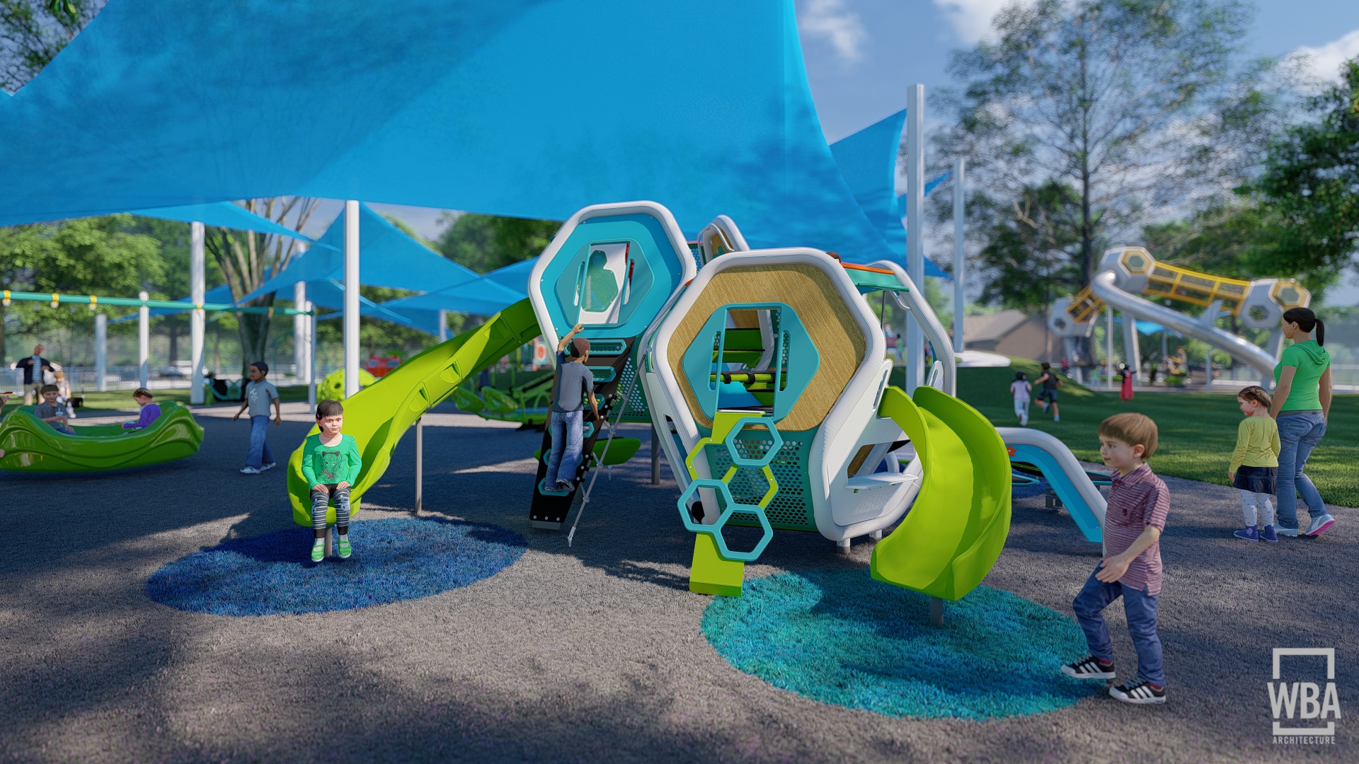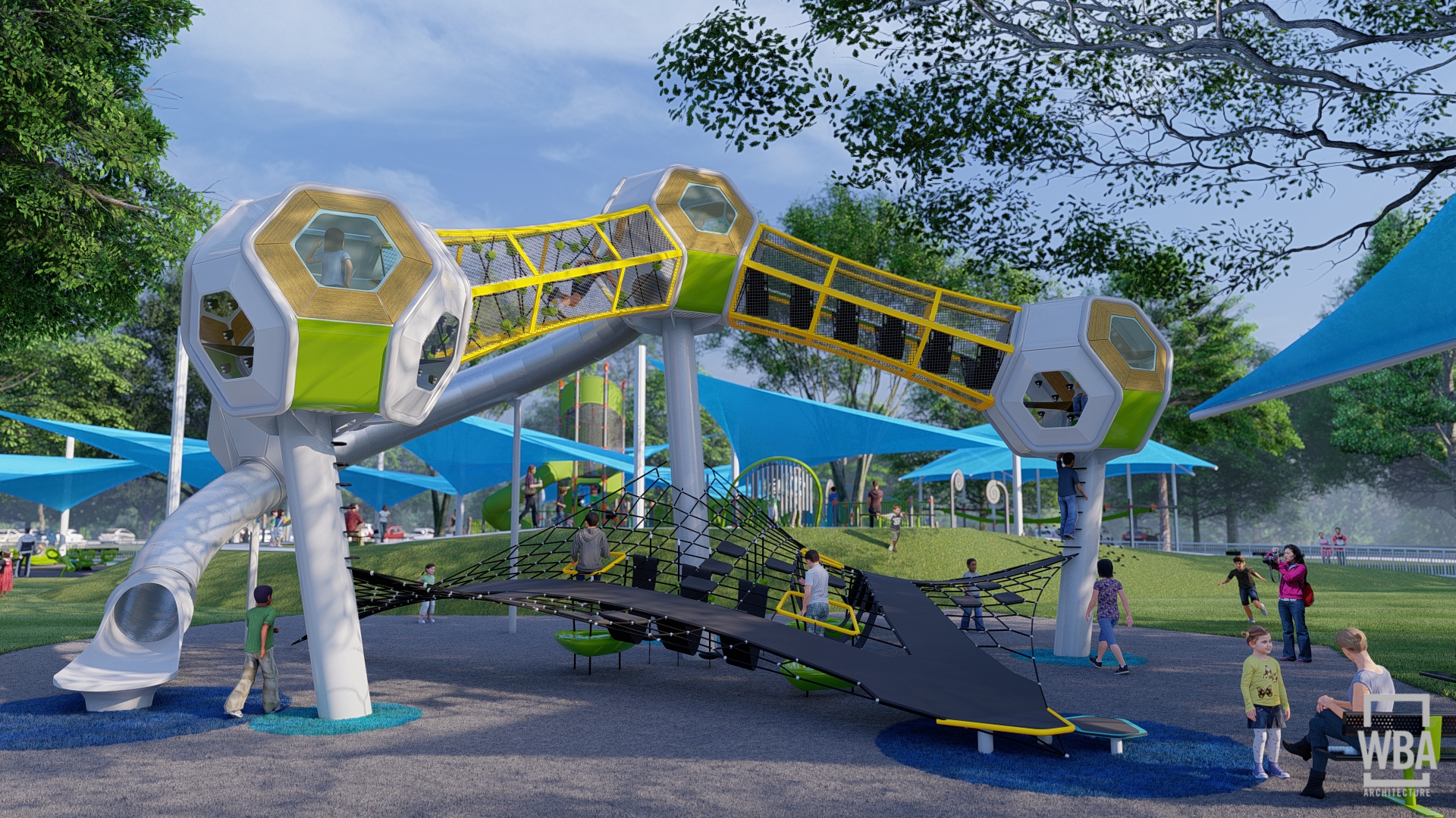 The 21st century playground will feature 80 play activities, 73 of these features will be inclusive to children with accessibility needs, and will be separated into different play areas based on age, for children ages 6 months to 12 years old. The playground will feature a unique play structure for ages 6-23 months, the Wedra, which is the first play structure in the world with this design. Another feature is the Hedra® Tower, which is designed for children ages 5-12 and is the fifth play structure in the country with this design.