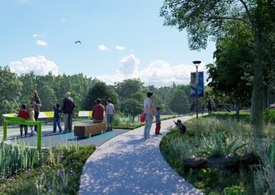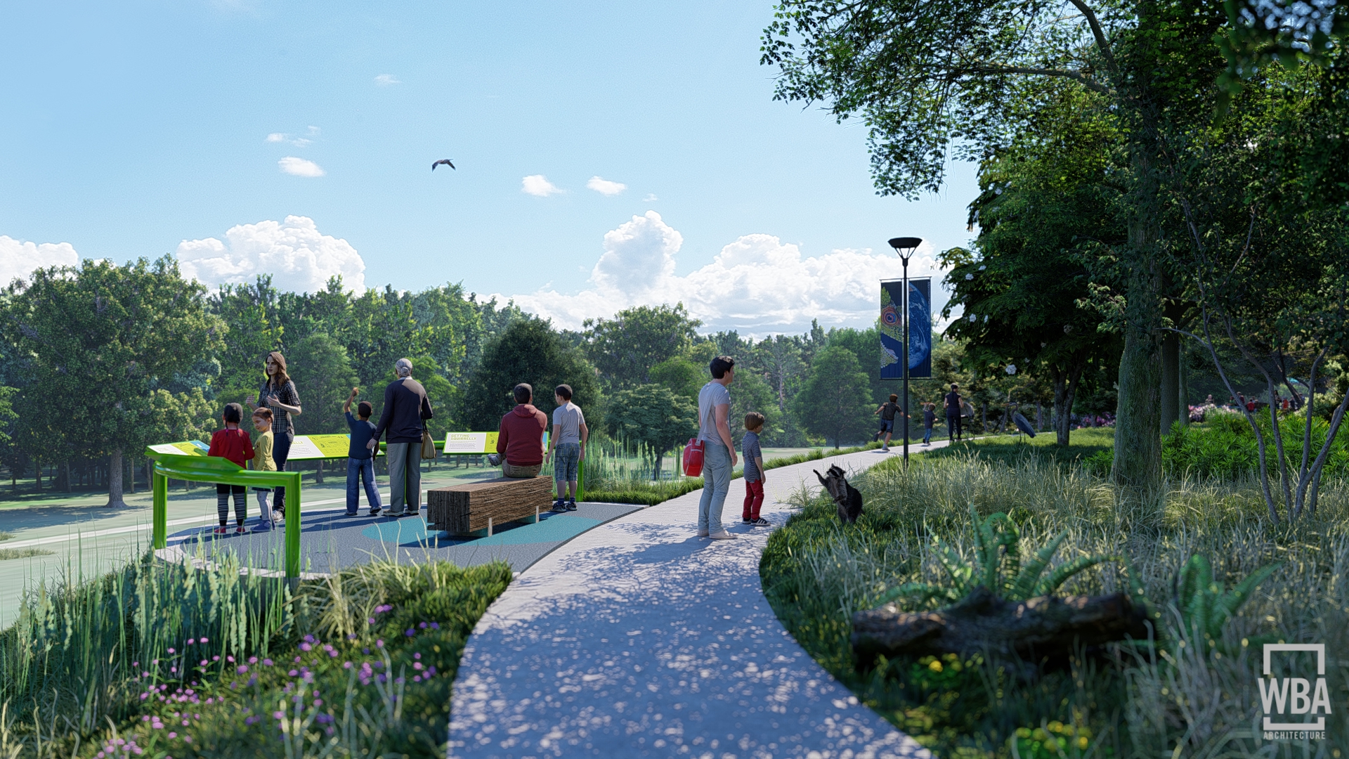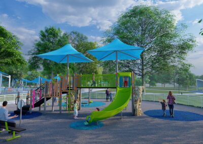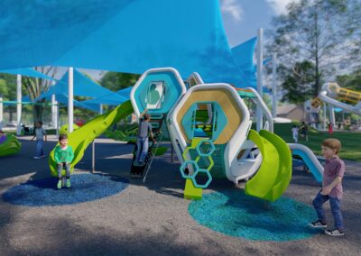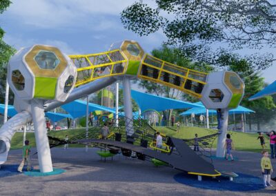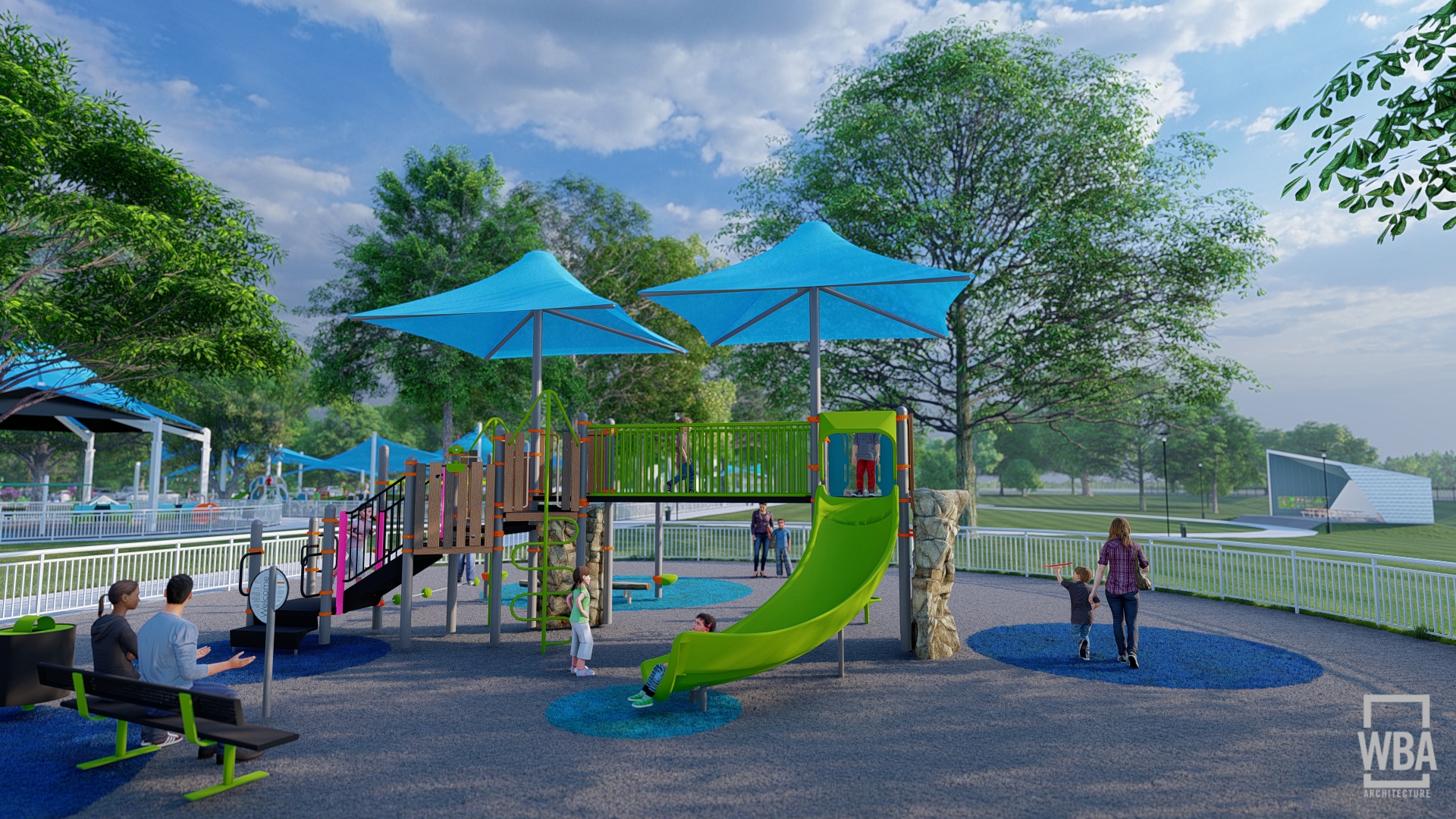 The 21st century playground will feature 80 play activities, 73 of these features will be inclusive to children with accessibility needs, and will be separated into different play areas based on age, for children ages 6 months to 12 years old. The playground will feature a unique play structure for ages 6-23 months, the Wedra, which is the first play structure in the world with this design. Another feature is the Hedra® Tower, which is designed for children ages 5-12 and is the fifth play structure in the country with this design.